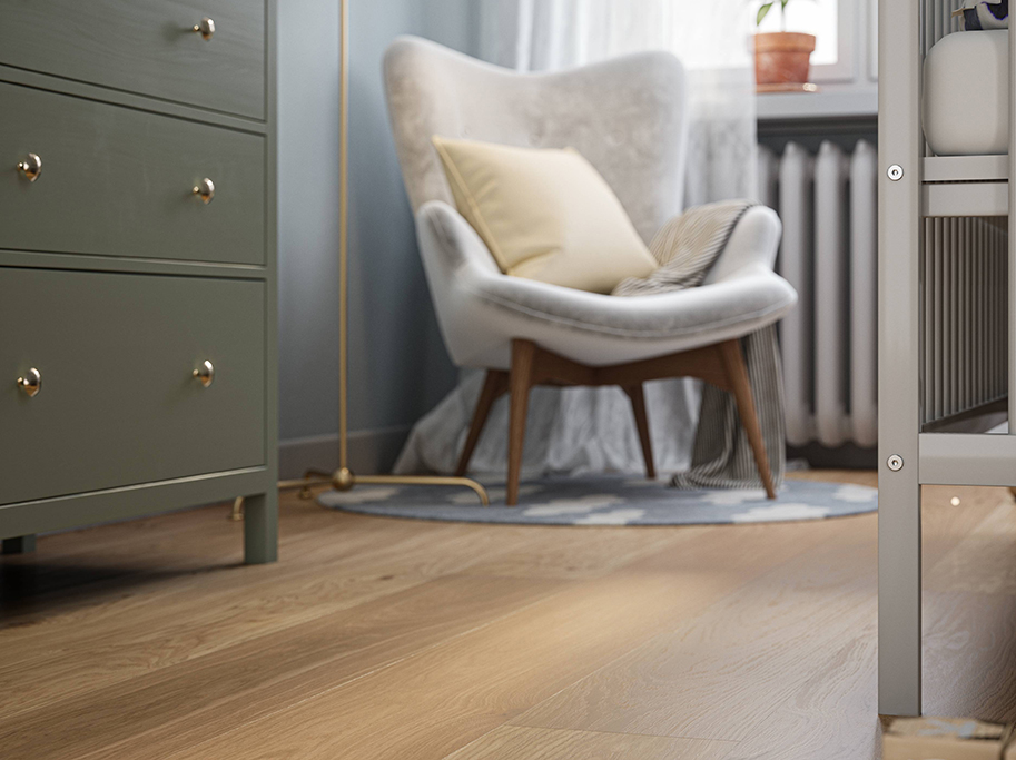 Den hærdede trækonstruktion i FSC-certificeret europæisk eg bidrager til en robust og stabil gulvløsning.