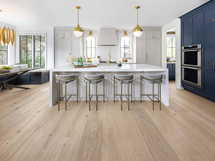 De ekstra brede XXL-planker skaber en rolig og sammenhængende gulvflade med færre samlinger. Samtidig forstærker formatet oplevelsen af rummelighed og giver rummet et mere helstøbt udtryk.