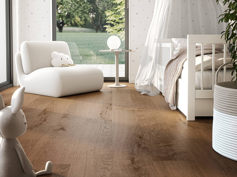 XL-formatet med 206 mm brede planker skaber en sammenhængende gulvflade med færre samlinger og et roligt udtryk. Den mørke nuance fungerer både som en varm base og som kontrast til lysere elementer i indretningen.