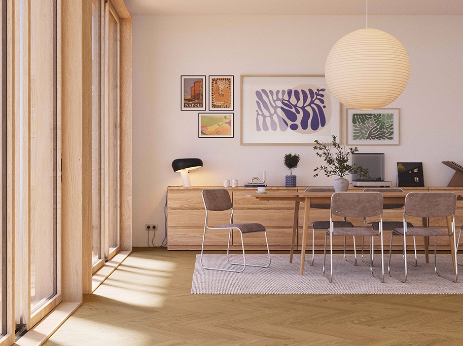 Med 5G Dry®-kliksystemet klikkes stavene nemt sammen uden brug af lim, søm eller specialværktøj. Gulvet er velegnet til gulvvarme og leveres med 20 års garanti.