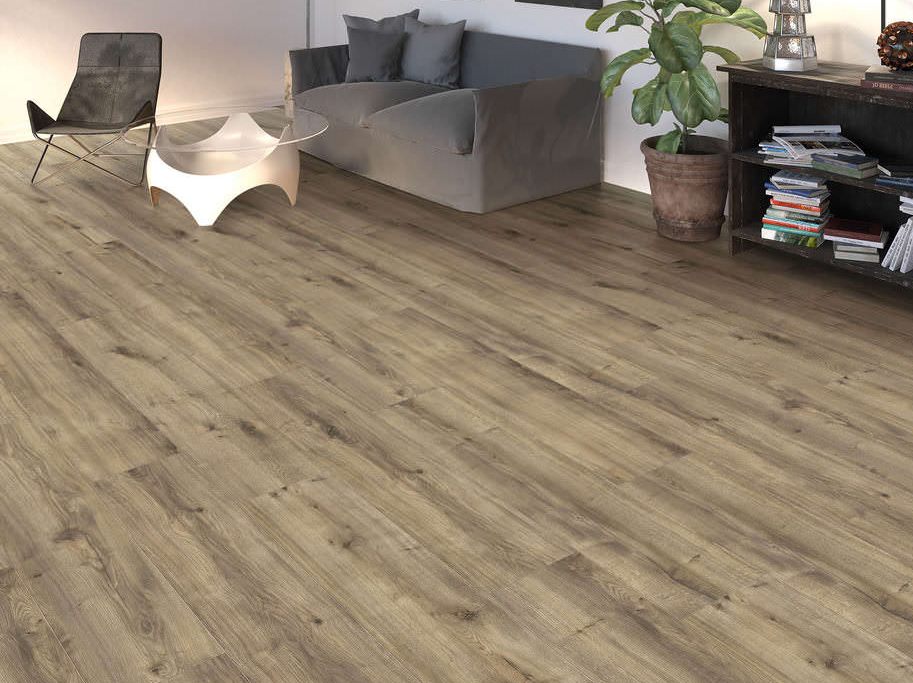 Designgulvets greige farve tilfører rummet dybde og varme, mens de livlige åretegninger og knaster fremhæver gulvets vellignende trælook.
