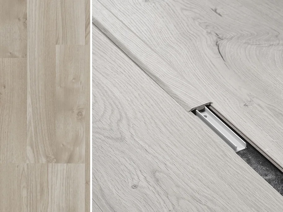 Denne T-listes virkelighedstro lyse og svagt gråtonede trælook gør, at den er et alsidigt valg til både lyse trægulve og laminatgulve, især dem med et lyst, let gråtonet udtryk.