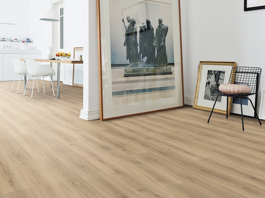 Smukt laminatgulv med et autentisk egetræslook. Gulvet er i et imponerende plankeformat med ekstra lange og brede planker, der giver dit gulv et imponerende look.