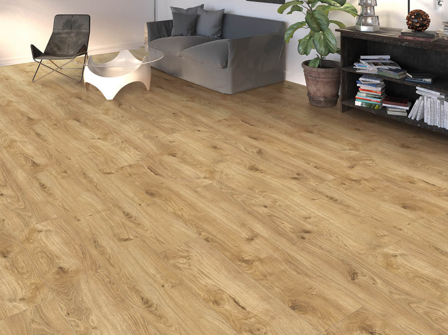 Eg Phoenix designgulvet fra HARO kombinerer varme, gyldne nuancer med en levende årestruktur, der giver gulvet et autentisk og rustikt udtryk, som til forveksling ligner ægte træ.
