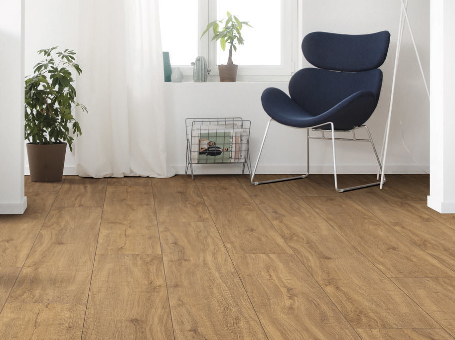 Gulvet består af flotte, lange planker, der giver rummet en elegant og åben fornemmelse. Hver planke er fremhævet med en 4-siders fas, hvilket skaber et naturligt og indbydende udtryk, der fuldender illusionen af et ægte plankegulv. Takket være det smarte integrerede 5G kliksystem er gulvet desuden hurtigt og let at lægge.