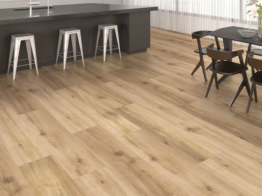 Den realistiske struktur og de fire mikrofasede kanter understreger plankelooket og tilføjer visuel dybde til rummet.