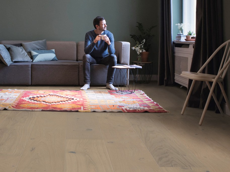 Plankegulvet er i en Sauvage sortering og har et rustikt udseende med tydelige knaster. Plankegulvet har fas på alle 4-sider, hvilket fremhæver de enkelte planker, når gulvet er lagt.