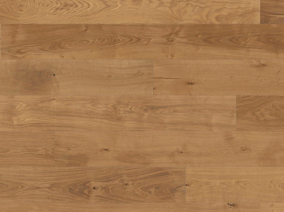 Overfladen er behandlet med den holdbare naturaDur matlak, som giver gulvet en elegant, silkeblød finish og beskytter det mod daglig slid. Plankernes imponerende dimensioner og eksklusive udtryk giver rummet en følelse af luksus og rummelighed.