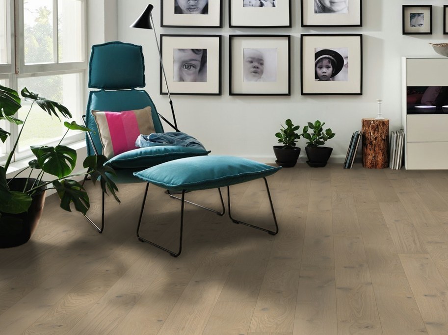 Lyst og moderne HARO plankegulv i gråtonet eg med en smukt børstet overflade, der fremhæver træets naturlige struktur og levendefarvespil.
