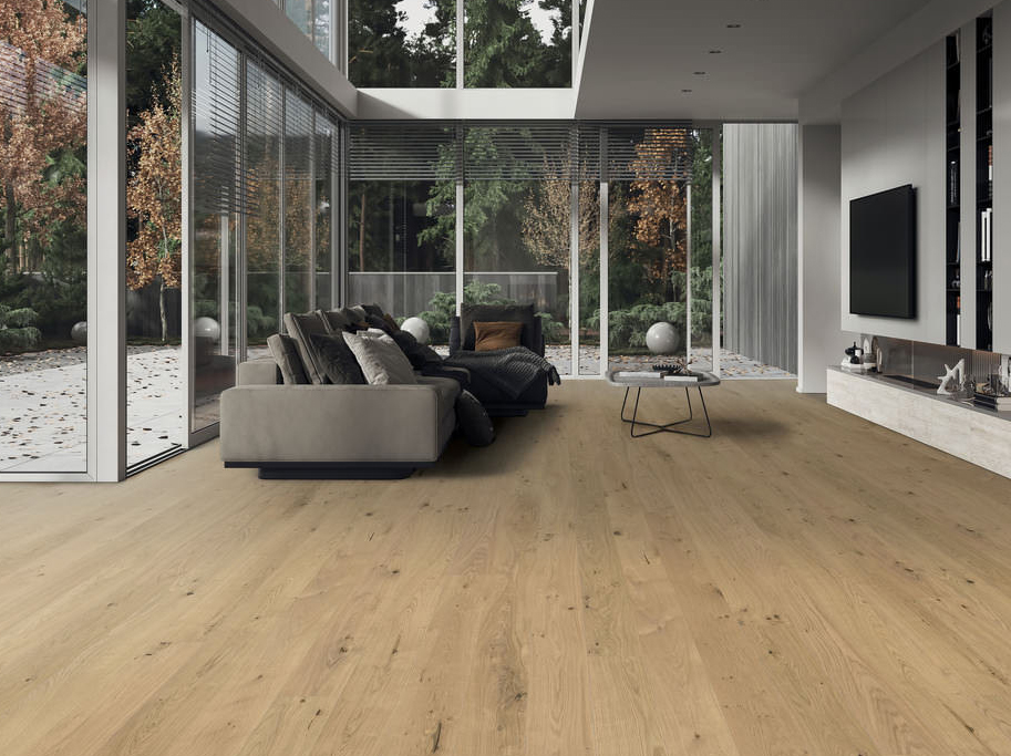 Trægulvets diskrete universal sortering giver gulvet et harmonisk udtryk, som passer perfekt ind i moderne hjem, hvor både lys og varme er i fokus.